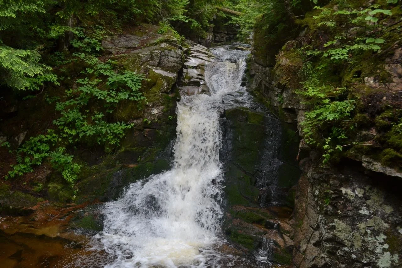 After 0.2 miles you will come to the first in a series of waterfalls and gorges. The trail splits at the first waterfall, you can hike up either side of the brook. Both sides offer unique and fantastic views of the cascades and the pools below. The trails terminate after 0.3 miles, meeting at a large bridge on the Upper Snow’s Mountain trail.